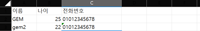 - C1에 "전화번호" 입력