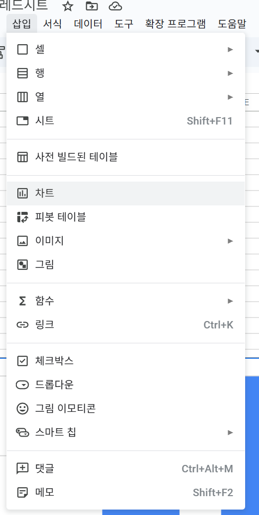 - 상단 메뉴에서 삽입 > 차트 클릭
