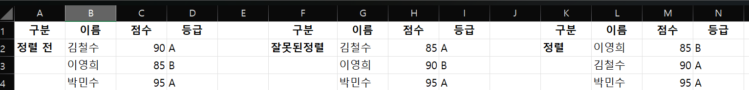 해결책: 전체 데이터 범위를 선택한 후 정렬하세요!