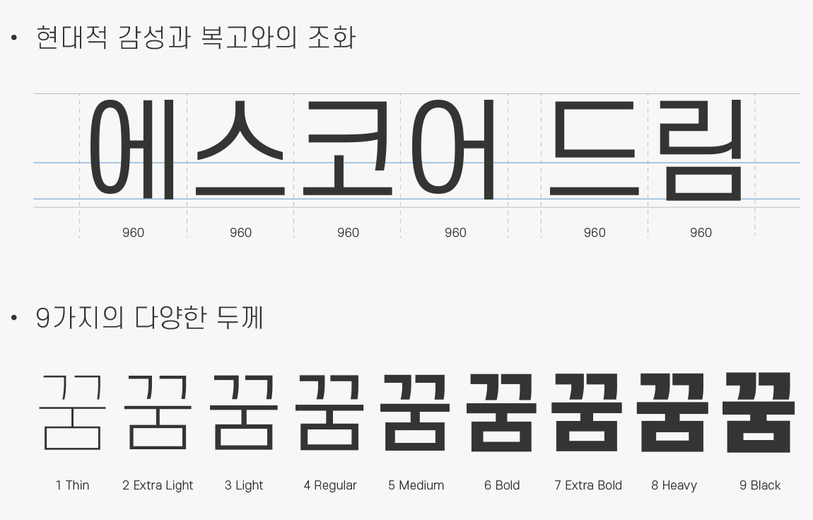 에스코어드림의 가장 큰 특징은 총 9가지 굵기를 제공한다는 점입니다. Thin(1), ExtraLight(2), Light(3), Regular(4), Medium(5), Bold(6), ExtraBold(7), Heavy(8), Black(9)까지 세밀하게 나뉘어 있어, 디자이너와 콘텐츠 크리에이터에게 폭넓은 선택권을 제공합니다.